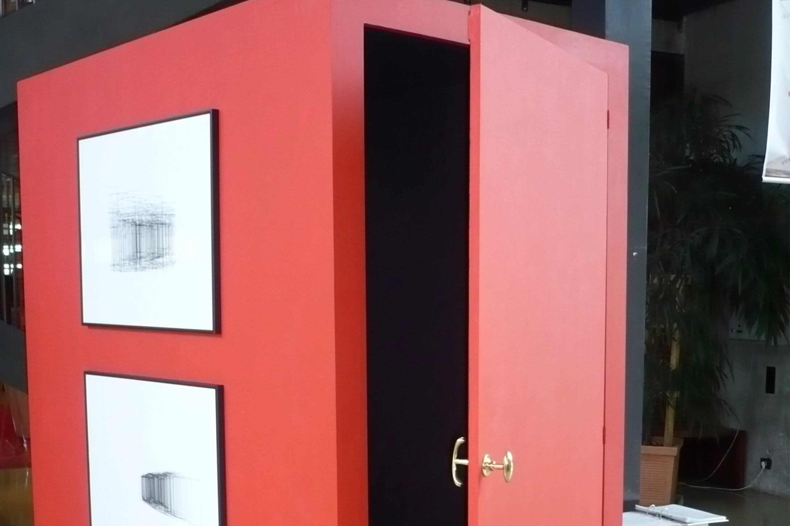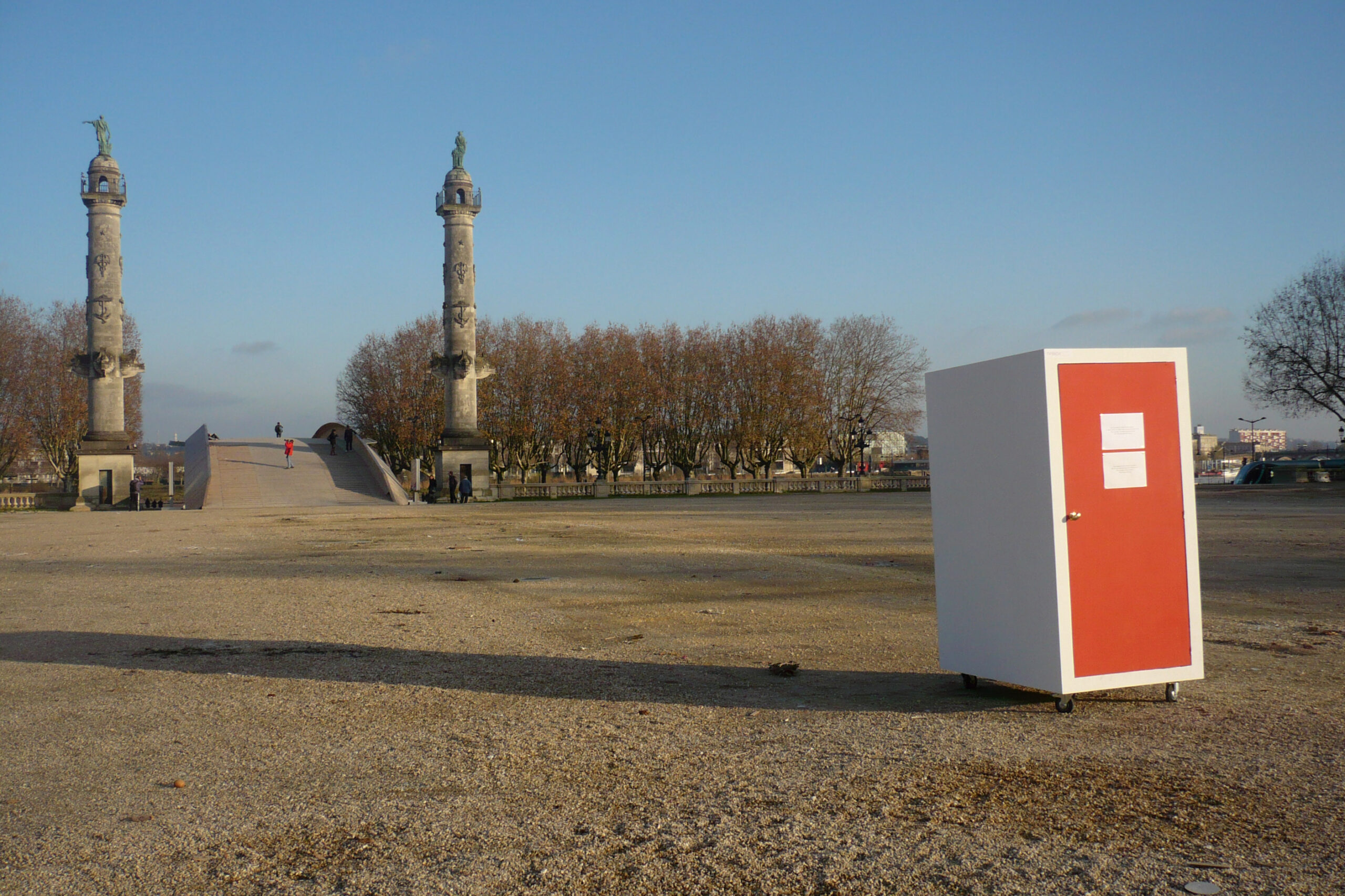 espace d’exposition itinérant sous la forme d’une boîte en bois opaque allongée en hauteur sur roulette à pousser partout.
